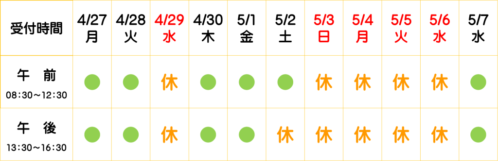 GW中の診療のご案内 ツイート ゴールデンウィーク前後の外来は、誠に恐れ入りますが混雑することが予想されますのでご了承ください。 ※●は診療 緊急の場合はいつでも対応いたします。下記の番号にご連絡くださいますようお願いいたします。 0166-22-6125